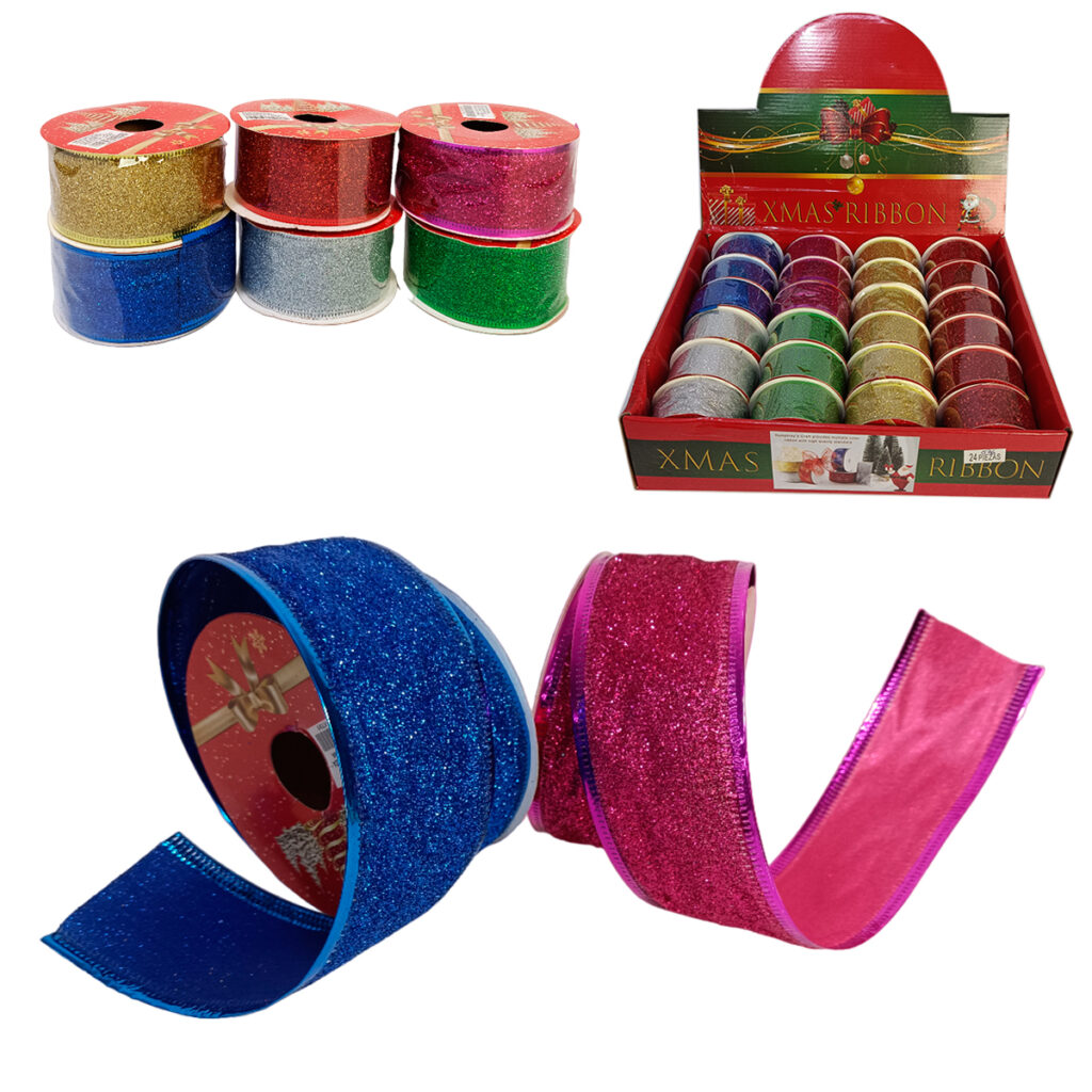 Disponible en varios colores, este listón navideño con glitter combina perfectamente con otros elementos decorativos, desde esferas hasta figuras navideñas, logrando armonía y estilo en cada detalle. Su superficie con glitter garantiza un brillo intenso que captura la luz y resalta en cualquier ambiente, ofreciendo un toque festivo que no pasa desapercibido.